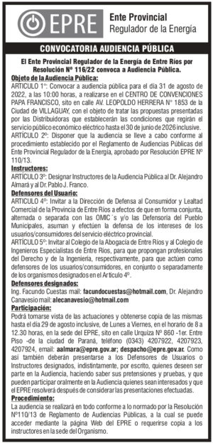 16/09/2022 - Paraná, 16 Sep – El Ente Provincial Regulador de la Electricidad (EPRE), en virtud de la Resolución N° 649 SEN de fecha 13/09/2022, publicada en el Boletín Oficial de la República Argentina el 15/09/2022, dictó este viernes la Resolución N° 166/22 que establece que a partir del 1 de octubre los usuarios categorizados como de […]
